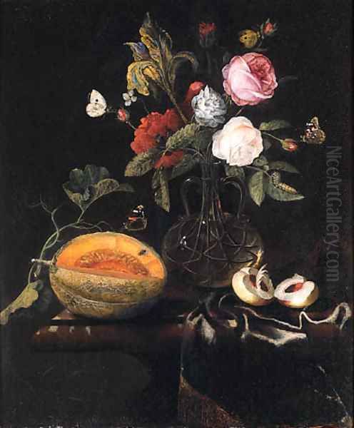 Bring the timeless beauty of Marten Nellius's Roses, an iris and other flowers in a glass vase, a melon and a peach with butterflies on a draped marble table into your home with a handmade oil painting reproduction. Carefully recreated on canvas by skilled artists using traditional techniques, this piece captures the delicate brushwork, subtle light, and vibrant color of the original masterpiece. With museum-level quality and rich texture, it brings elegance and artistic depth to any space. Enjoy free shipping and make this masterpiece a part of your personal collection.