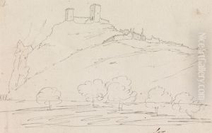 An Extensive Hilly Landscape With A Town In A Valley And A Castle In The Midground