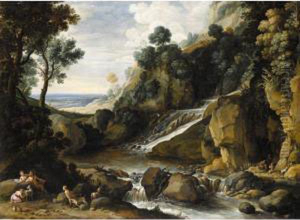 Rocky Landscape With A Waterfall Nymphs And Satyrs Resting By A River