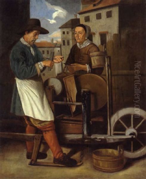 Ein Scherenschleifer Mit Einer Alten Frau Auf Einem Stadtplatz