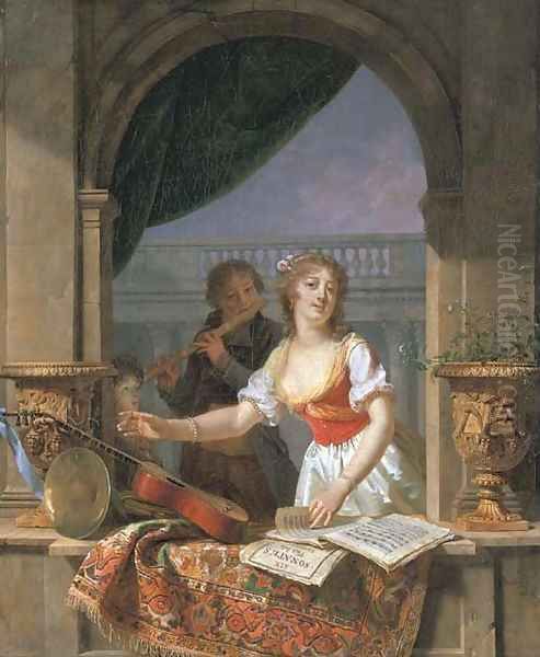 A young lady reaching for a guitar at a stone casement and a boy playing the flute beyond