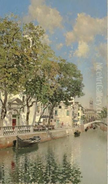 Gondolas On A Canal, Venice Oil Painting by Martin Rico y Ortega