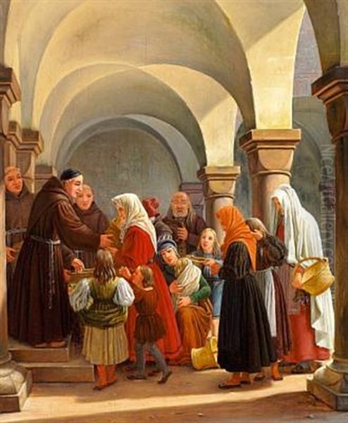 Alms. Monks Distributing Food To The Poor In An Italian Cloister