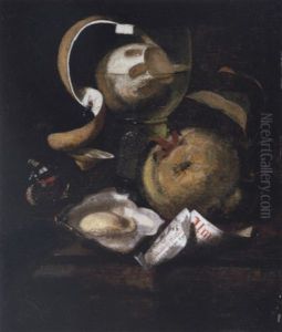 Still Life Of A Peeled Lemon In A Roemer, An Apple, Paper, Oyster And Butterfly On A Ledge