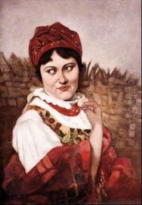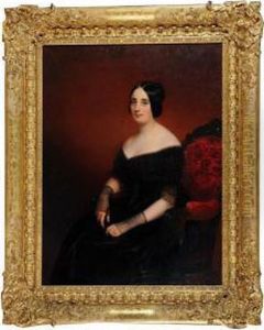 Portrait Of A Woman Wearing At Blue And White Satin Gown