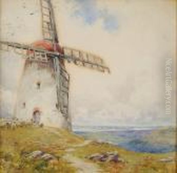 "an Old Landmark" - Sheep Grazing Near A Windmill, An Extensive Landscape Beyond