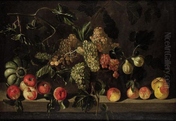 A Still Life Of Bunches Of Grapes And Figs In A Basket, Together With A Pumpkin, Apples, And Pears On A Stone Ledge