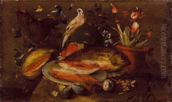 Natura Morta Di Fiori, Frutta E Pesci