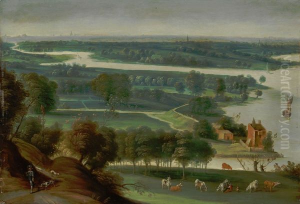 Extensive wooded river landscape, with a hunter on a path and a milkmaid