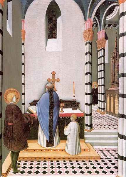 Bring the timeless beauty of Master of the Osservanza's St. Anthony at Mass Dedicates his Life to God 1435 into your home with a handmade oil painting reproduction. Carefully recreated on canvas by skilled artists using traditional techniques, this piece captures the delicate brushwork, subtle light, and vibrant color of the original masterpiece. With museum-level quality and rich texture, it brings elegance and artistic depth to any space. Enjoy free shipping and make this masterpiece a part of your personal collection.