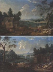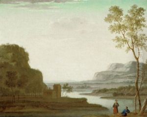 Figures Resting On The Banks Of A River, With Mountains In The Distance
