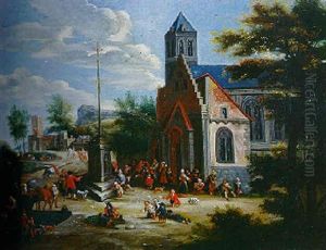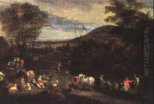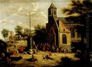 Italianate Landscape With Travelling Players Performing To A Crowd