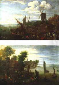 An River Landscape With Figures Along The Banks, A Town Beyond