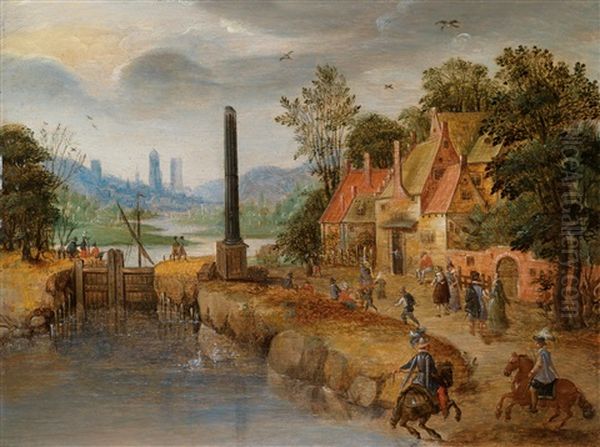 Eine Reich Staffierte Dorfansicht Mit Einem Kanal Und Einer Schleuse