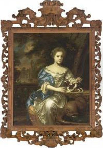 A Portrait Of A Young Lady, Said To Be Maria Simonides Van Nijs, Seated Three-quarter Length, Wearing A White Satin Dress With Orange Satin Lining And A Blue Satin Shawl With Pearl Jewellery, Together With A Dog On A Table Near A Fountain, A View Of A Gar