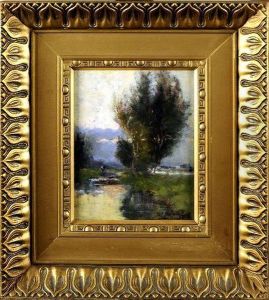 [paysage Boise Avec Pecheurs A La Mare]