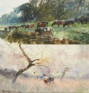 Pecheur Dans Sa Barque En Bord D"etang; Vaches Au Pre Sur Fond De Clocher (2 Works)
