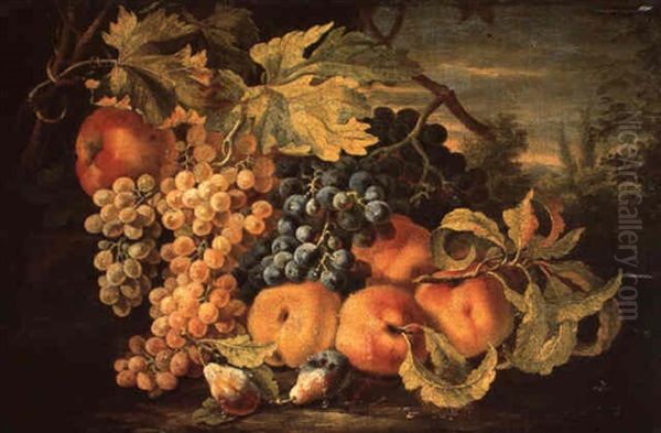 Raisins Et Peches Devant Un Paysage