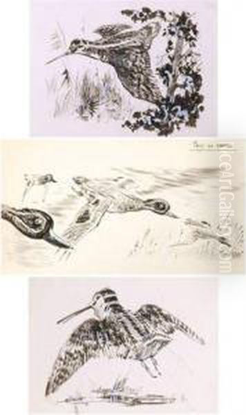 Tryptique Encadre. Panneau Central Representant Des Sarcelles Plongeant Et Titre . Signe En Bas A Droite