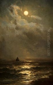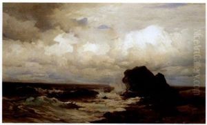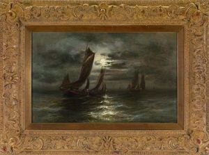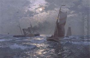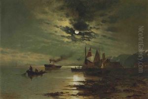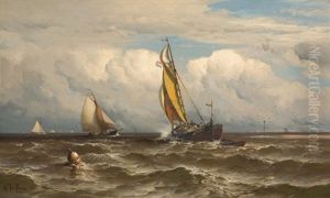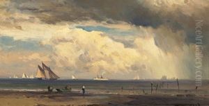 Lobstermen Off A Northeast Coast (maine?) With A Packet Ship And A Steam Tug In The Distance