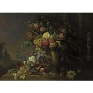Summer Blooms In Brass And Copper Ewers By A Grape Vine (+ Summer Blooms And Grapes In A Basket By Peaches, Cherries, A Pumpkin, A Brass Ewer And A Vine On A Ledge; Pair)