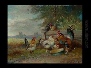 Hahn, Huhner Und Kuken Am Trog