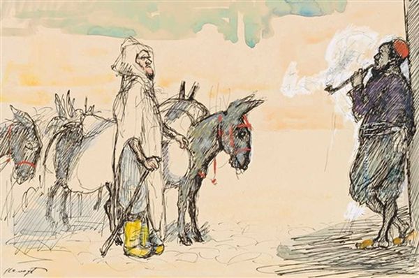 Orientalische Szene Mit Einem Haik Tragenden Eselstreiber Und Einem Pfeifenrauchenden Mann, Der Sich Lassig An Eine Wand Anlehnt