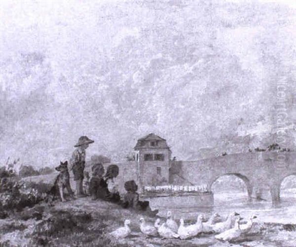 Kinder Mit Hund Und G,nsen Am Flusufer