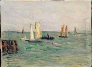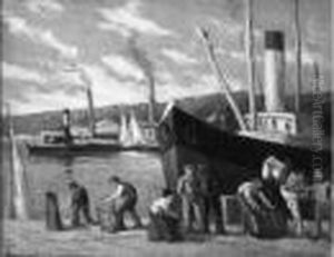 Paris, Peniches A Quai Devant Le Louvre Huile Sur Carton Toile