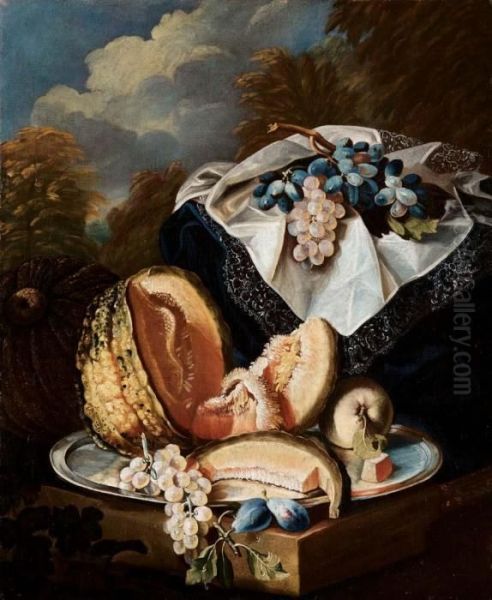 Natura Morta Con Una Zucca Aperta, Uva E Una Pesca Su Un Vassoio
