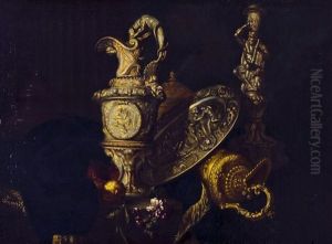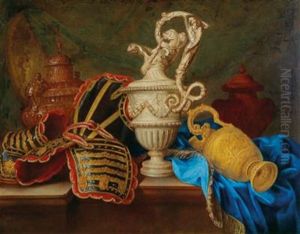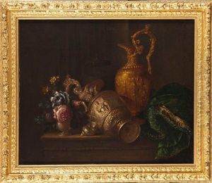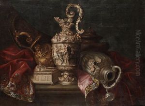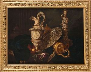 A Still Life With An Ornate Silver Gilt Ewer, A Silver Gilt Jewellery Casket, Shells, Oranges And A Pomegranate, All Arranged On A Partly Draped Stone Ledge