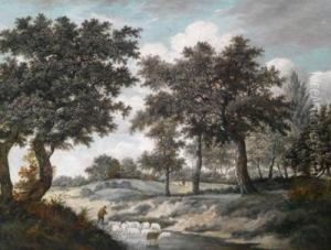 A Wooded Landscape With A Shepherd And His Flock Crossing Ariver