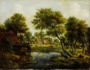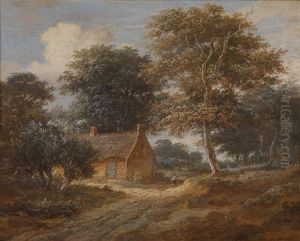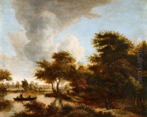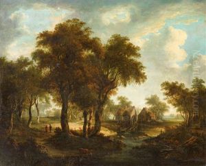 A Wooded Landscape With Figures Fording A Stream Near A Cottage