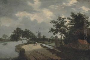 A River Landscape With Figures Conversing On A Path, A Windmill Beyond