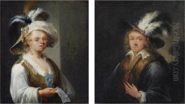 Portrait Of A Lady, Half Length, Wearing A Pastoral Dress With A Wide-brimmed Feathered Hat, Holding A Music Sheet