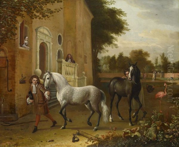 Grooms with Horses, a Grey and a Dark Bay, at Nijenrode Castle
