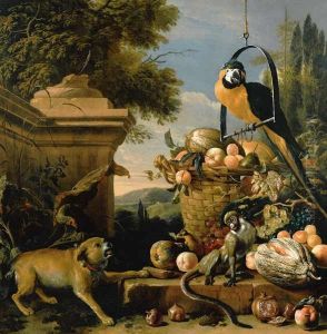 Scarlet Macaw perched on an urn with other birds and a monkey eating grapes