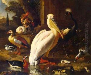 Exotic Fowl, Including A Peacock And Peahen, Flamingo, African Crane, Pheasant, Lapwing, Shoveller, Pelican And Tufted Duck In A Garden Setting
