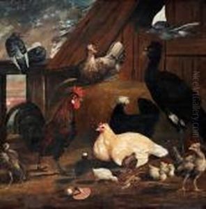 A Cockerel, A Chicken, A Magpie And Other Birds By A Farm Building