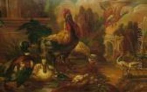 A Cockerel And Hens In A Landscape; And A Hen, Chicks And A Peacockin A Landscape