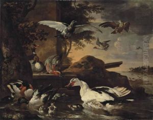 A Classical Garden Landscape With A Mallard, A Golden Eagle And Other Wild Fowl In Flight