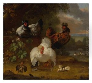 Hens, Chickens, A Dove And A Bird Of Prey In A Landscape