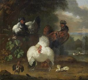 Cockerels And A Hen Before A Lake, A Villa Beyond