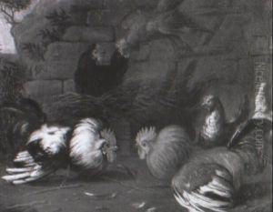A Cockerel And Hens In A Landscape, A Farmhouse Beyond