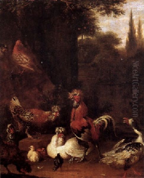 A Cock, Hen, Chickens And A Duck At The Foot Of A Tree, A Classical Garden Beyond