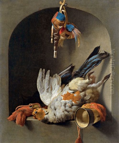 Trompe L'oeil-stillleben Mit Einem Rebhuhn, Falkenhaube Und Einem Jagdhorn In Einer Steinernen Nische