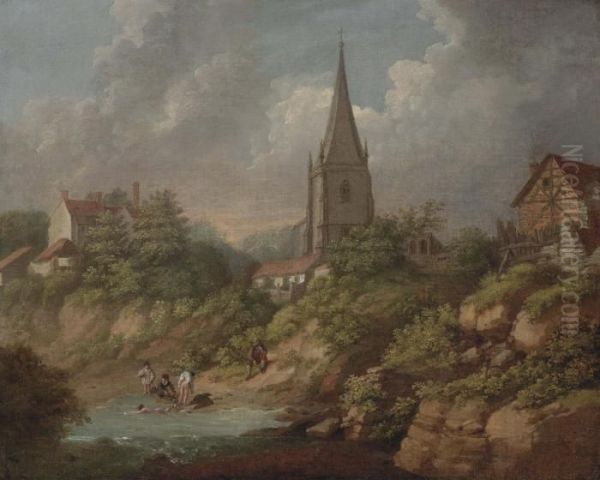 A View Of Monmouth With The Church Of St Mary's, Bathers In The Foreground