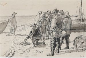 En Skagensfisker i olietoj i en dorabning spejder ud over havet.