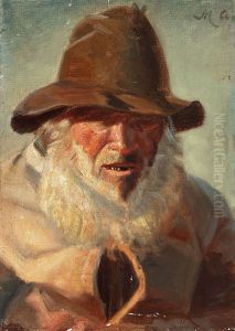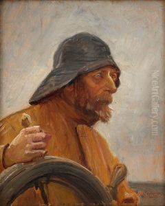 Interior with Holger Drachmann at the fireplace in Villa Pax, Skagen.