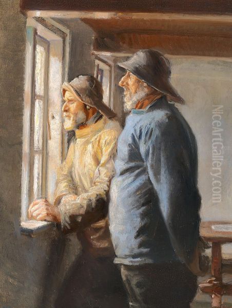 Two fishermen of Skagen watching the sea through a window.